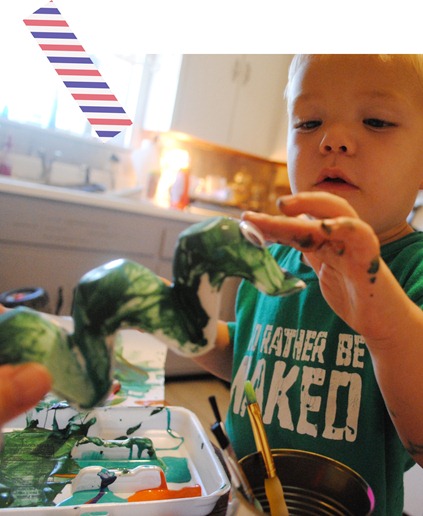 I cut the shapes for Jaxon…and then he “went to town” painting them. We also used the top of the carton as a paint tray…use what you have!