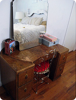 I’ve had this vanity forever now. I love it. It was also a past thrift store find. I don’t think I’ll paint it because I like the old woody look it has. I do need to make a new little chair cushion though. That’s a treasure I found pre-divorce at a estate sale for $5. The red silk seat pad just isn’t happening. For now though…it will work!!