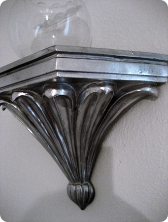 This is a pair of shelves that were a flat, dingy looking black. I think they were $2.99 each at Goodwill. Silver spray paint made them have a whole new life!